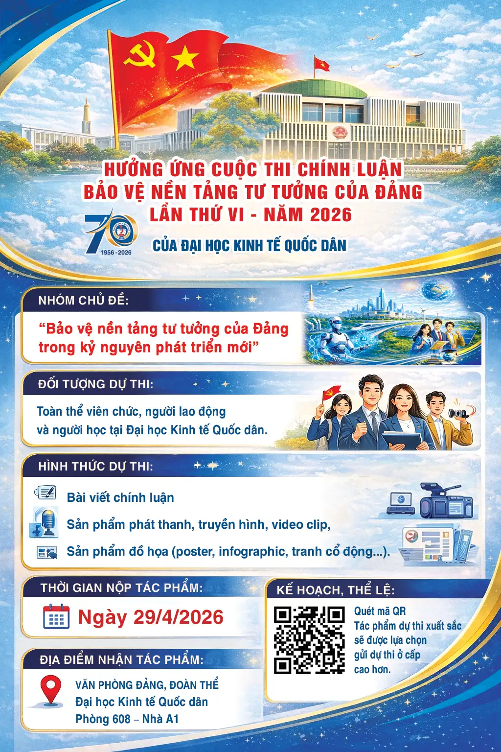 Thực hiện kế hoạch tổ chức Cuộc thi chính luận bảo vệ nền tảng tư tưởng của Đảng lần thứ VI năm 2026, Đại học Kinh tế Quốc dân phát động và khuyến khích toàn thể viên chức, người lao động và người học tích cực tham gia với các nội dung cụ thể như sau: